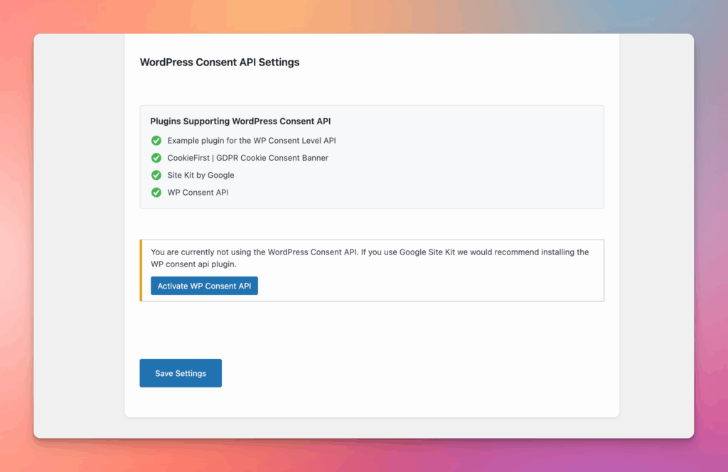 IF the WordPress Consent API is not activated the user sees nudge to activate: