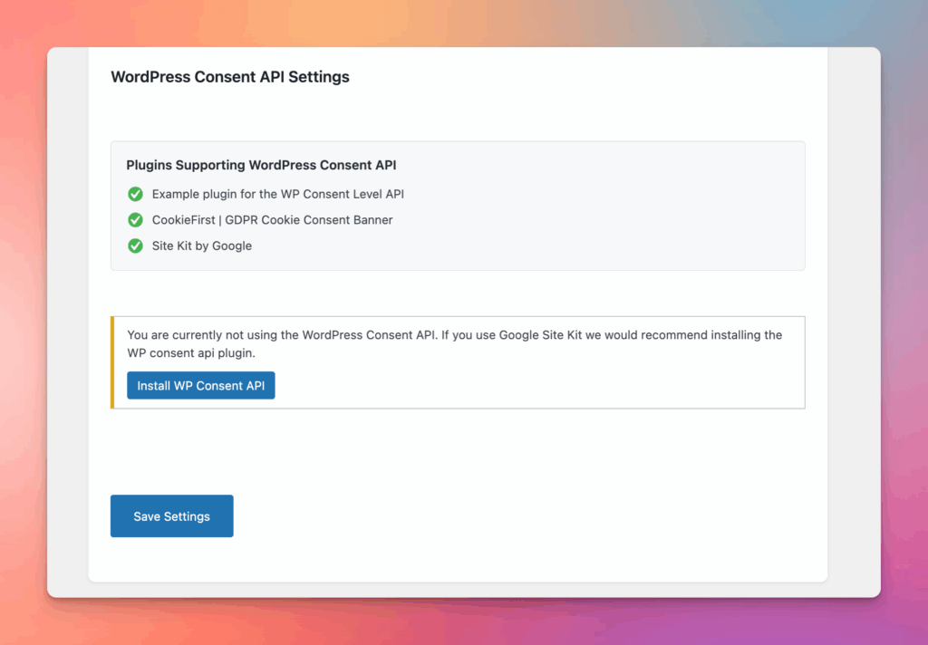 If the WordPress Consent APi is not installed the plugin shows nudge to install with direct install button: